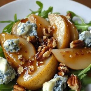 - Arrange the arugula/spring mix/spinach on serving plates and top with the warm pears, crumbled blue cheese/gorgonzola/roqufort and toasted walnuts or pecans.